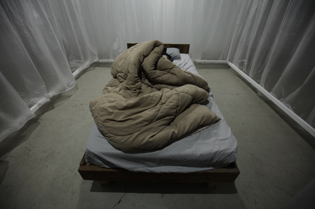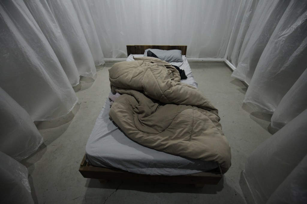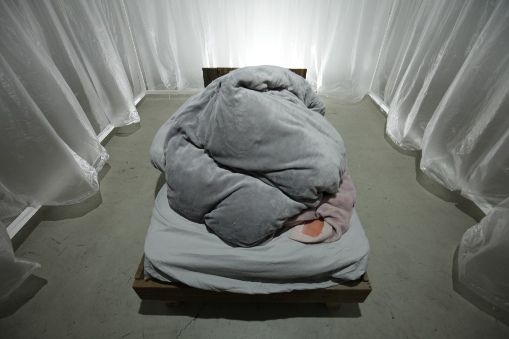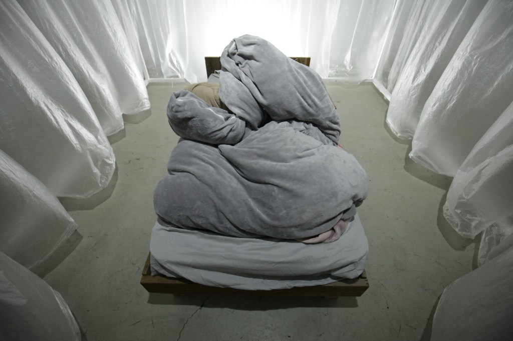 鑑賞者はビニールで覆われた見えないベッドを見えない中見るしかない。