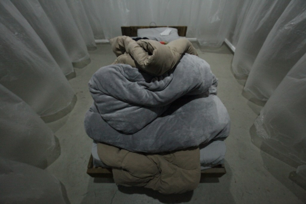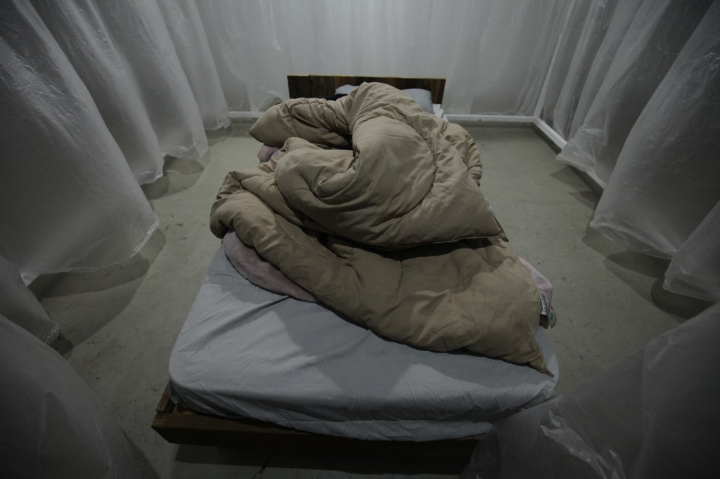 会期中22:00-8:00までの間、展示会場に設置されたベッドで眠る。朝起きて展示会場から仕事に向かう。