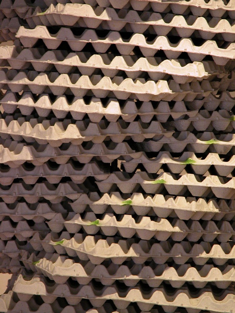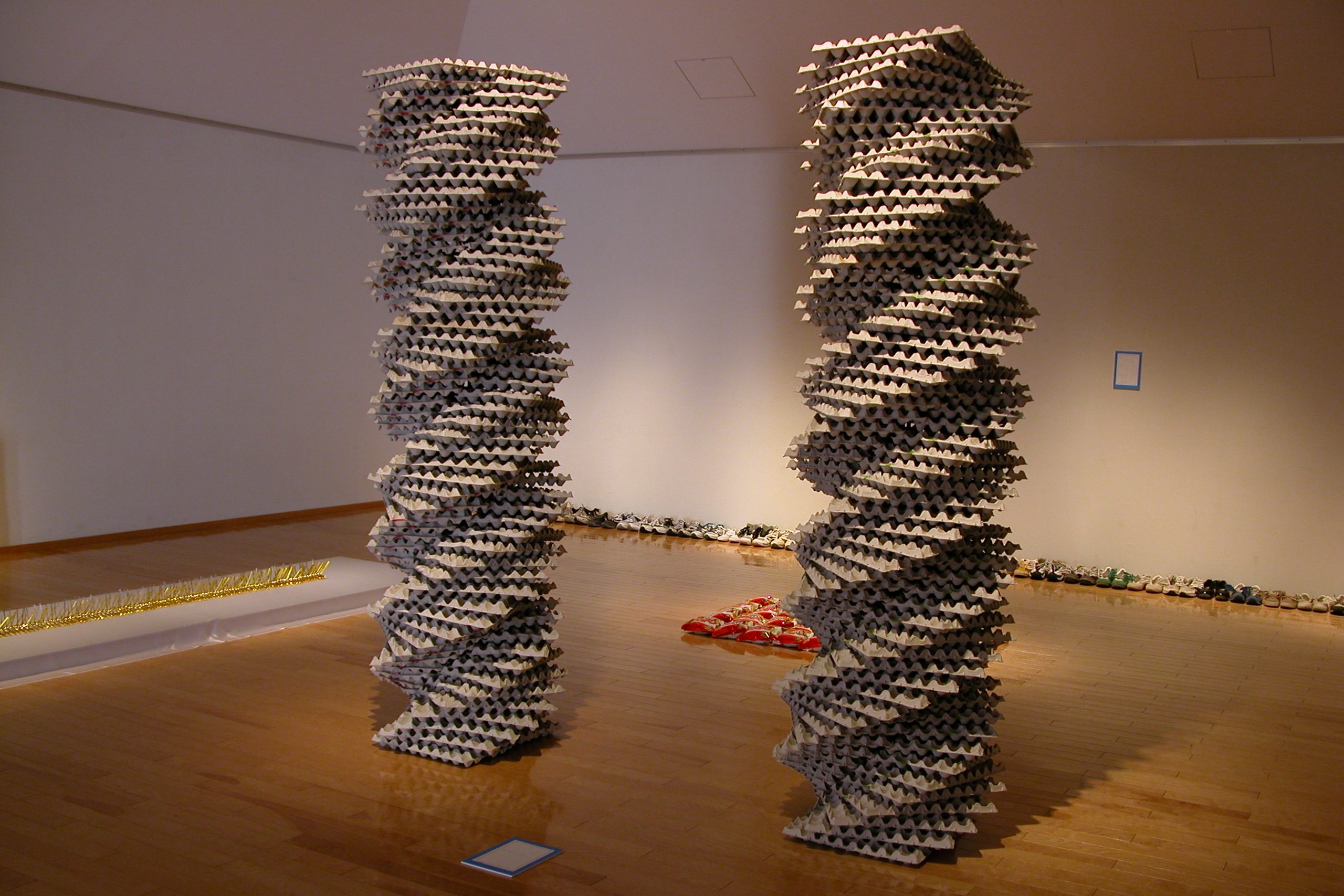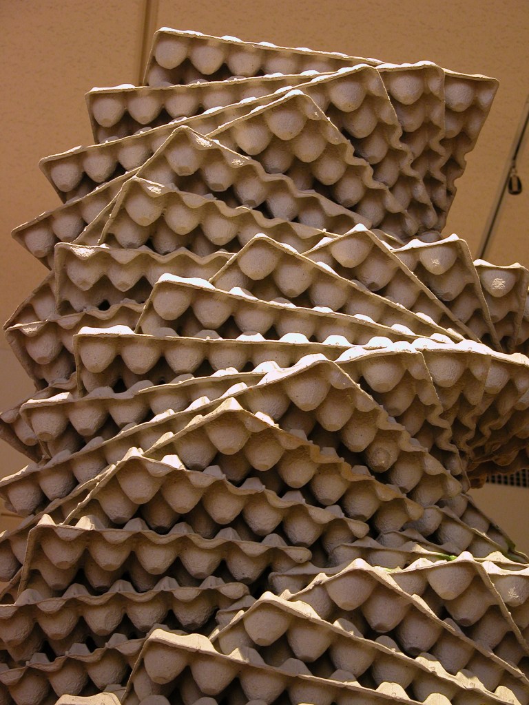 一つの要素が集合することにより、まったく別の要素に見えてくる。それを表す為に、無機物なもの(卵パック)を螺旋状に積み重ね、躍動感を与えることにより、有機的な見え方に変化させる。そして単体では軽く、薄い卵パックを、積み重ねて塔のようにする事で、量感、高さなどの空間の変化を表す。