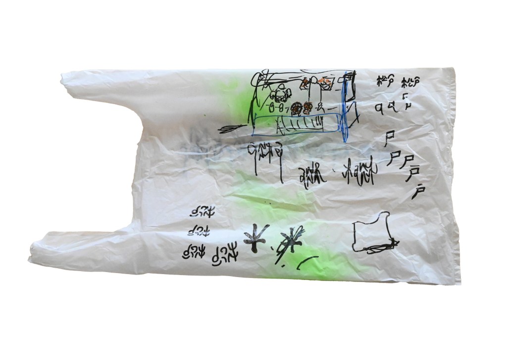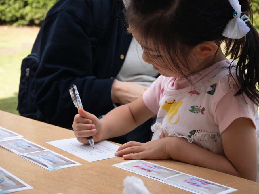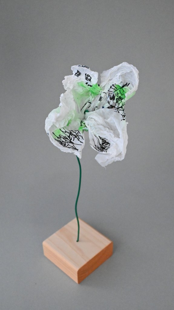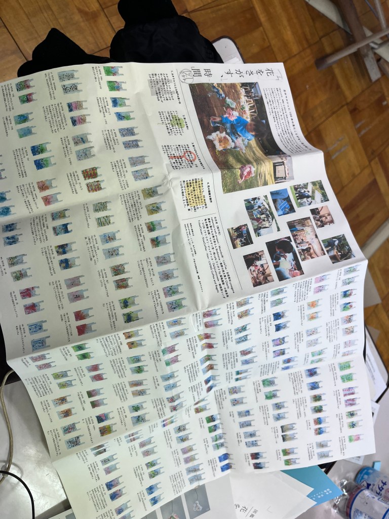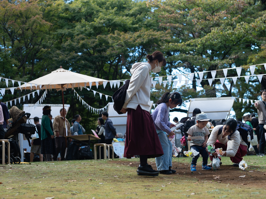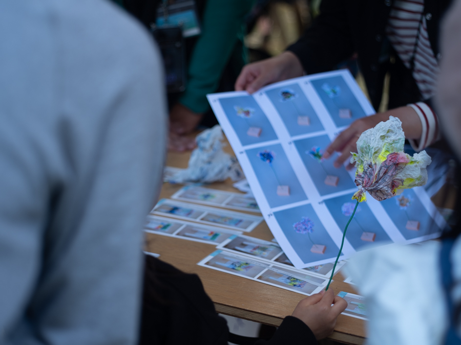 『花をさがす、時間』は 2023 年『科学と芸術の丘』にて開催されたマルシェプログラムです。 宝探しのように、ヒントを受け取り自分だけの花を探す遊びを行いました。花は事前ワーク ショップにて『松戸のイメージ、思い出、おすすめの場所』など松戸市に対しての思いが描か れた絵から作られています。100 本の花々にはまだ名前は無く、花の名前はプログラムに参加し、 ヒントをもとに発見した第一発見来場者が決めます。1本の花ができるまでに、見ず知らずの 2人(ビニール袋に思い出を描いた製作者、そのビニール袋から出来た花を発見し花の名前を つけた発見者)が繋がっています。