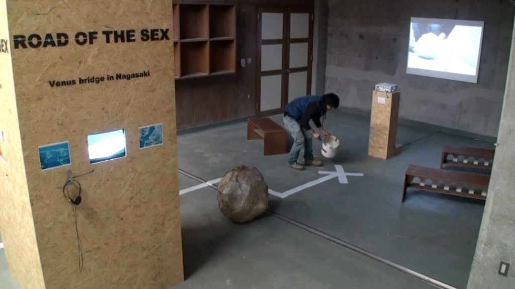 本作は、地面や床にラテックスを塗布し、それを剥がして巻き取っていく行為の連鎖を記録した『Road of the sex』シリーズ作品。タイトルは、本シリーズを初めて発表したフランス・ナントにおいて、制作中に通りがかりの者から投げかけられた野次に由来する。私にとって、この「誤解」や「予期せぬ外部からの介入」もまた、場所と自身の境界を形成する重要な成分となった。大学の体育館、あるいは実家で親や兄と共に剥がし取る行為を通じて、その場所の汚れ、時間、そして家族との対話までもがラテックスという「皮膚」に吸着され、一つの彫刻へと成長していく。それは単なる記録ではなく、場所の記憶を物理的に剥ぎ取り、コミュニケーションを物質化していく、身体的なアーカイブの試み。