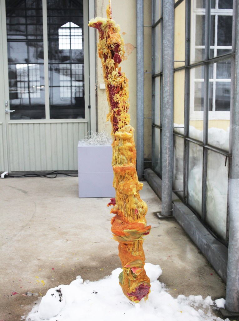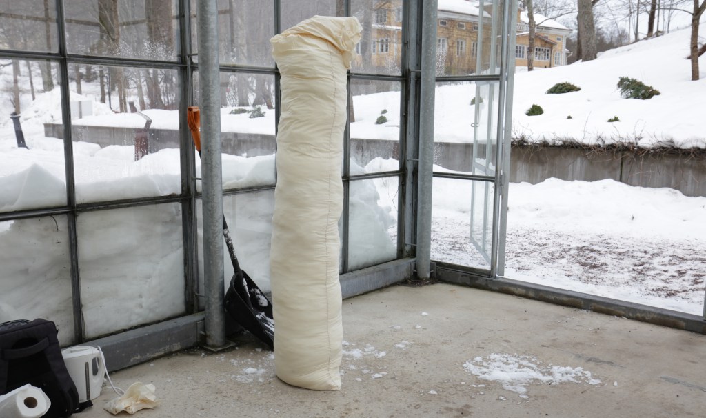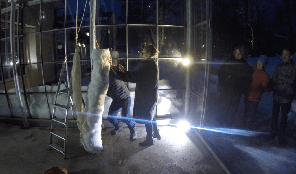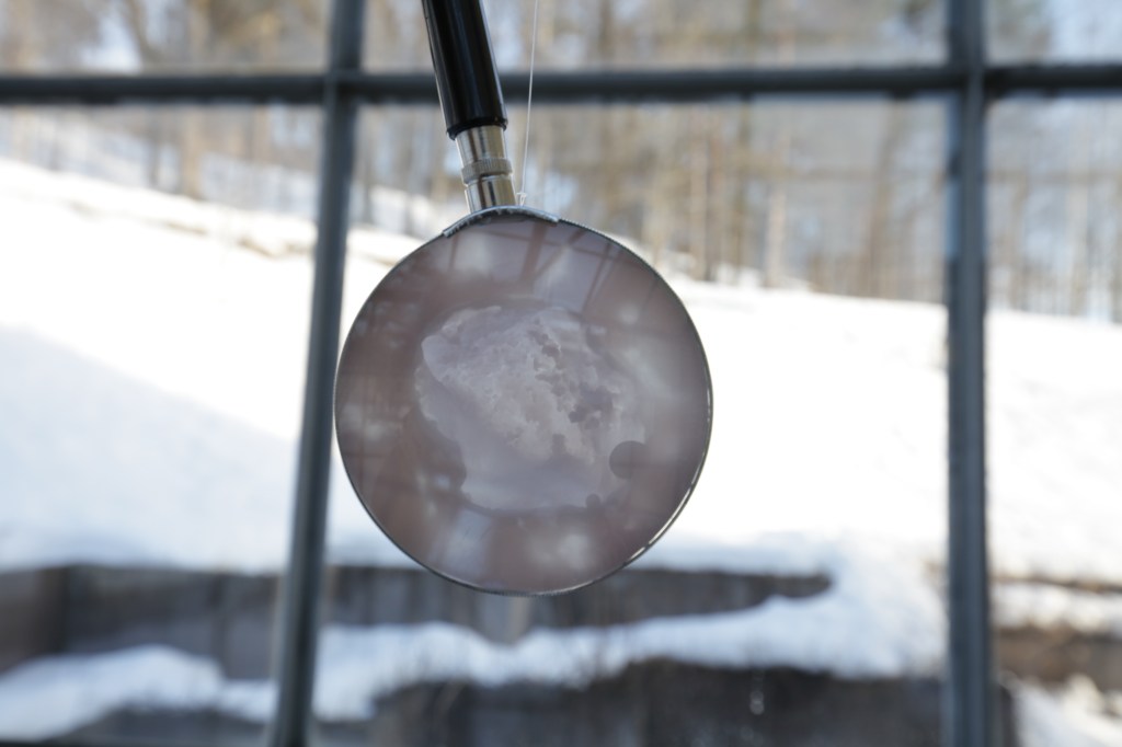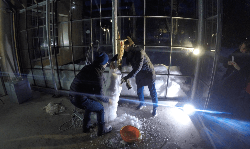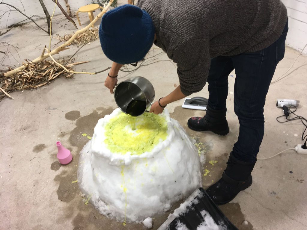 雪で大いに遊んだ今回の作品は、温度により形を作り出すドローイングの実験でもあった。熱した蝋を雪の塊の中に流し込んでいく。流し込んだ瞬間から、蝋の熱は雪に吸収され、また雪の冷たさは蝋により温められ溶けていく。この温度の複雑なやり取りは、私が見ることができない雪の中で行われ、複雑な形を形成する。この作品は雪の形をトレースしたのではなく、温度の複雑なやり取りを記録した、温度グラフのようなものである。