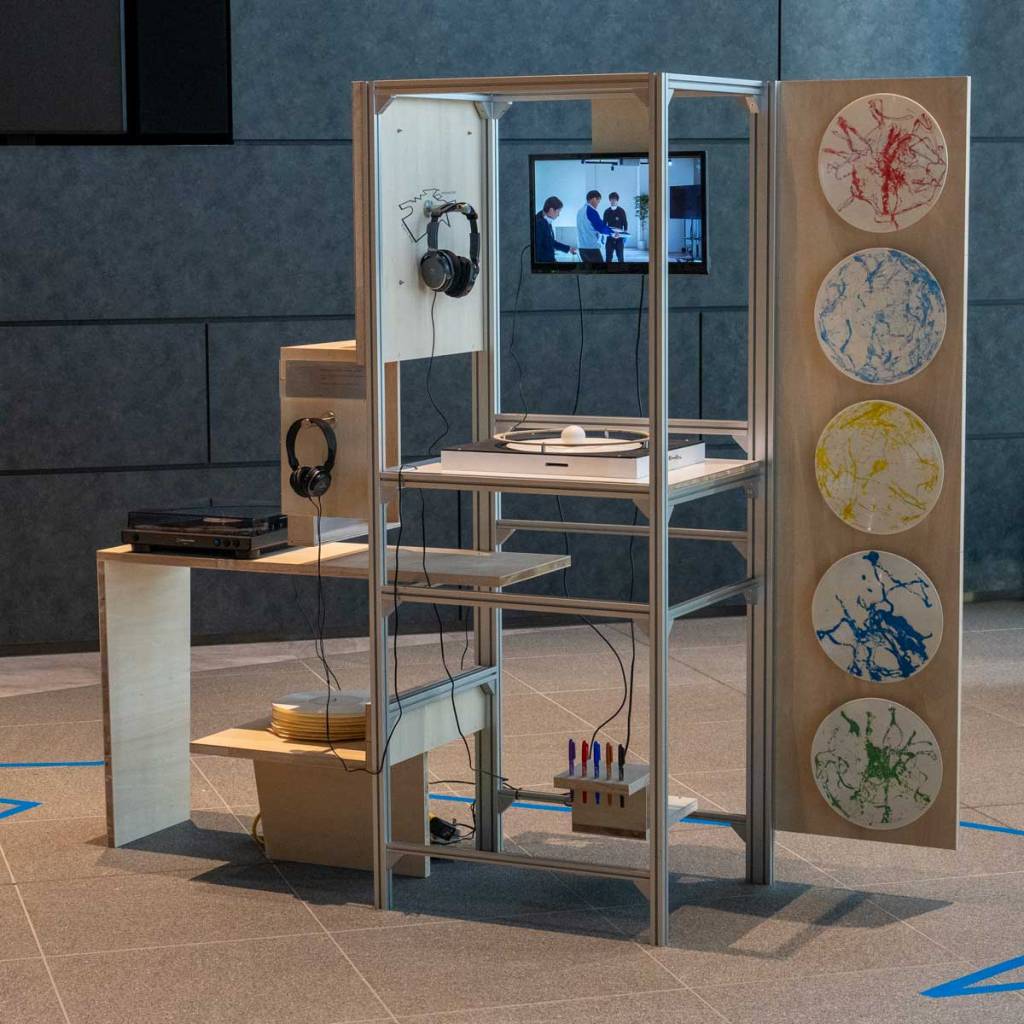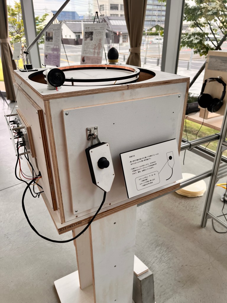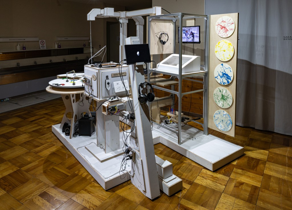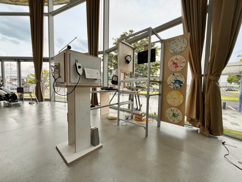 本作はスバルデザインラボを起点とし、史跡金山城跡ガイダンス施設、太田市美術館・図書館へと巡回する過程で、土地の歴史や空間の記憶を吸収しながらバージョンアップを重ねていった。会場に描かれた群馬県の輪郭の上を、参加者は生卵を運びながら歩く。その不安定な歩行の記録は、12インチの白いレコード盤へと刻まれ、5名の参加者による旋律へと昇華される。